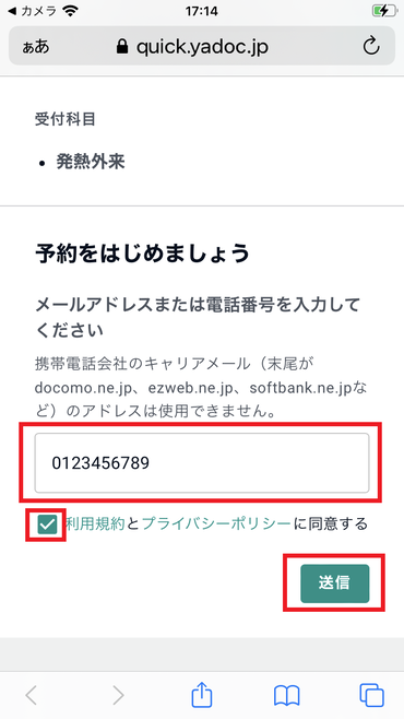 専用の予約フォームへアクセスし、メールアドレスもしくはSMSを受け取れる電話番号を入力してください。