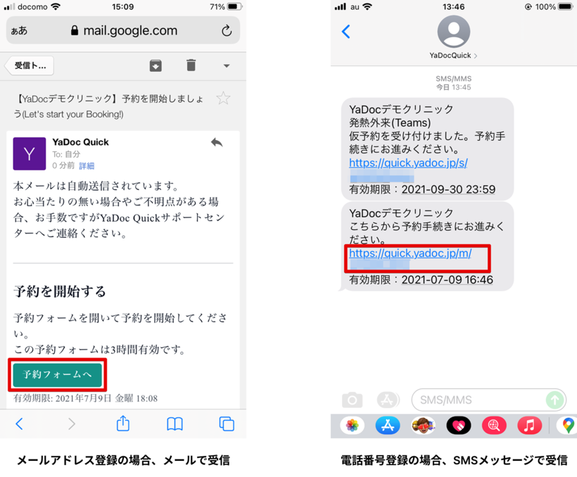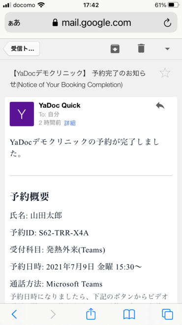 登録したメールアドレスまたはSMSに予約完了のメールが届きますので、予約日時に間違いがないかご確認ください。