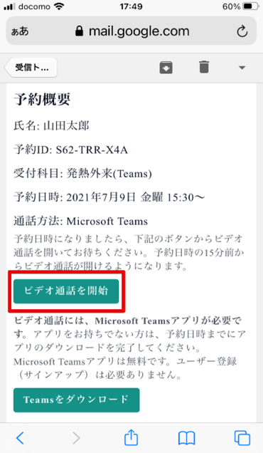 予約時間になりましたら、予約完了メール内の「ビデオ通話を開始」をクリックしてお待ちください。